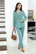 Костюм женский с юбкой из трикотажа. Кофта с цельнокроенными рукавами и отрезными бочками. Перед со средним швом и защипом на 0,2 см вдоль него. Спинка со средним швом. Горловина V-образной формы. В качестве отделки нашивка в правом нижнем углу переда. Юбка длинная, расклешеная к низу. Заднее полотнище со средним швом. Пояс выполнен из декоративной эластичной тесьмы. Внешний вид фурнитуры может отличаться от заявленной на фото.