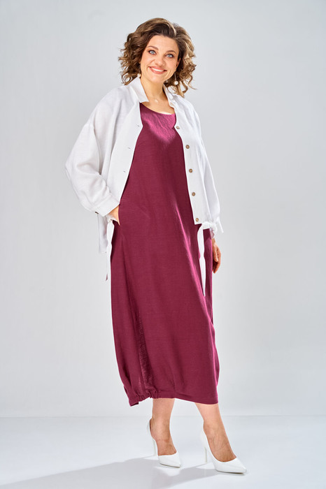 Комплект женский состоит из рубашки и платья. Платье длинное, свободного кроя. Спинка со среднем швом, разрезом, талиевыми вытачками, 2-мя складками по низу. Перед с нагрудными вытачками и складками по низу. Карманы обработаны в боковых швах. Низ платья по бокам собран на резинку. Рубашка совбодного кроя с центральной застежкой на 5 петель и пуговиц. Спинка с округлым подрезом и отделкой в ивде надписи. Перед по низу фиксируется кулисой и завязками. Воротник на стойке с обработанной горловиной . Рукав втачной, одношовный со спущенной линией плеча. По низу рукава манжет с застежкой.