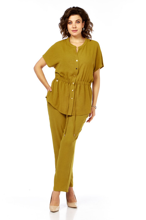 Комплект брючный состоит из блузы и брюк. Блуза полуприлегающего силуэта с центральной застежкой на петли и пуговицы. Линия плеча спущенная, воротник стояче-отложной с отрезной стойкой. По переду и спинке на линии талии -кулиса со шнуром. По боковым швам разрезы. Брюки прямые, верхний срез обработан поясом с резинкой. В бококвых швах карманы. В качсетве отделки используется шнур.