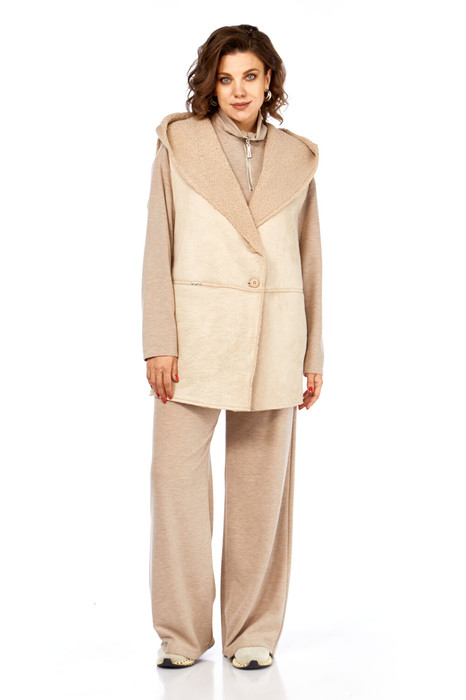 Комплект брючный состоит из кофты, жилетки и брюк. Кофта полуприлегающего силуэта со спущенным плечом, рукав втачной, одношовный. Воротник стойка с застежкой на тесьму-молнию. По боковым швам разрезы. Брюки расширенные книзу, верхний срез обработан поясом с резинкой. В боковых швах карманы. Жилетка свободного кроя со смещенной застежкой на петлю  и пуговицу. По спинке горизонтальный рельефный шов на перед, в котором обработаны карманы. Цельнокроенный капюшон с центральной частью. В качестве отделки используется фурнитура.