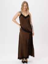 Комплект женский состоит из юбки и рубашки. Рубашка свободного кроя с центральной застежкой на петли-пуговицы. Спущенное плечо, втачной одношовный рукав (фиксируется отворот на петлю и пуговицу) по переду прорезные карманы с листочкой. Воротник-стойка. Юбка длинная, верхний срез обработан поясом на резинке с застежкой на петлю и пуговицу в левом боковом шве с потайной тесьмой-молнией. Юбка кроенная по косой. На заднем полотнище талиевые вытачки.