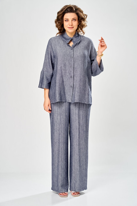Комплект брючный состоит из рубашки и брюк. Рубашка свободного кроя со спущенной линией плеча, с центральной застежкой на петли и пуговицы. Рукав уельнокроенный, воротник стойка, по переду карманы с листочкой. Брюки широкие, в боковых швах обработаны карманы.