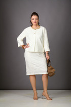 Комплект женский состоит из брюк и жакета. Брюки прямые, свободного кроя с карманам в  боковых швах и поясом на резинке. Жакет прямого кроя с центральной застежкой на 3 петли и пуговицы. Перед с боковыми накладными карманами, левый карман украшен печатью. Воротник отложной с лацканами, правый лацкан украшен печатью. Рукав втачной со спущенной линией плеча. В боковых швах обработаны разрезы. Длина по спинке 72-74 см, длина рукава 29-30 см. Длина брюк 107-108 см.