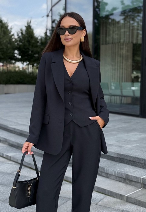 Жакет полуприлегающего силуэта, длиной ниже линии бедер. Спинка с вертикальными рельефами. Перед с центрально-бортовой застежкой на 2 петли-пуговицы и воротником пиджачного типа, вертикальными рельефами, доходящими до линии кармана в рамку с клапаном. Рукава втачные двухшовные. Жакет на подкладке.