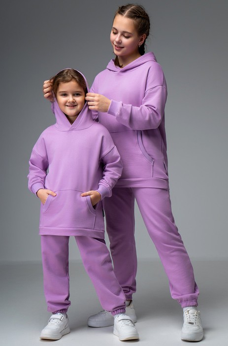 Футер трехнитка из 100% хлопка дарит мягкость. Хлопковый трикотаж средней плотности (310 г/м2) гармонично сочетает в себе нежность и прочность, создавая идеальные условия для активного отдыха. Сиреневый костюм станет стильным акцентом.
