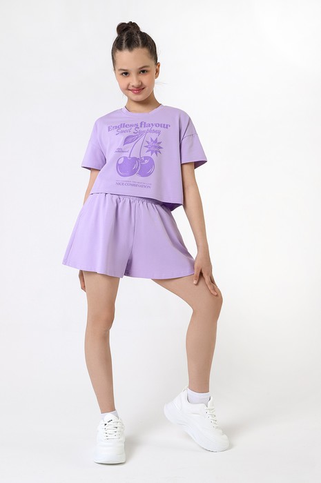 Эффектный костюм для девочки из хлопкового полотна с лайкрой. Футболка с принтом в модной стилистике, свободная, со спущенной линией плеч, округлым вырезом горловины, короткими рукавами. Шорты-юбка с боковыми карманами, на притачном поясе с отстроченной эластичной тесьмой.