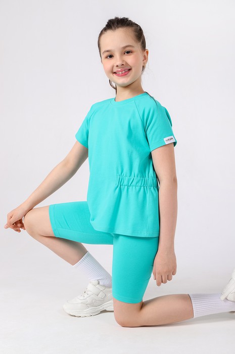 Костюм для девочки. Футболка слегка приталенная по бокам с помощью эластичной тесьмы, рукава покроя "реглан" с прямыми линиями пройм, короткие. Шорты "велосипедки" прилегающего силуэта, длиной выше колен. По низу рукава и шорт - небольшие декоративные нашивки.