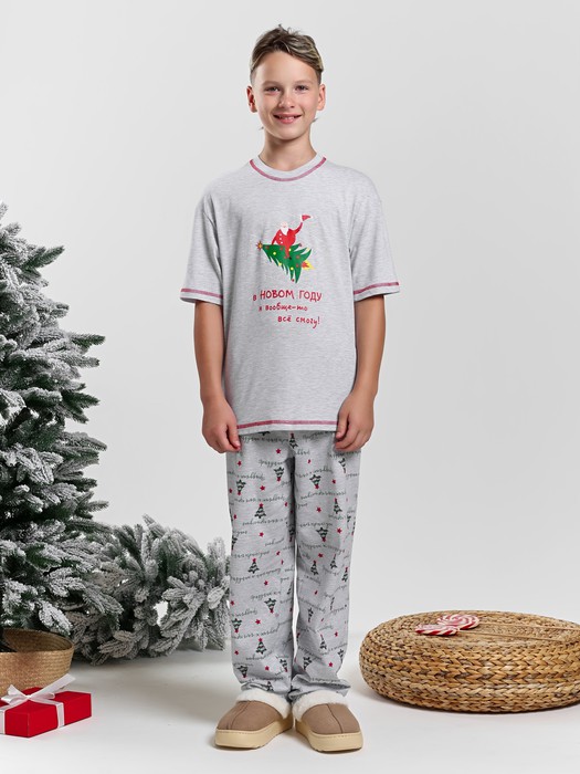 Костюм для мальчика из трикотажного полотна в комбинации двух видов: полотна "кулирка-кармеланж" и полотна "кулирка" с набивным тематическим рисунком на сером фоне , состоящий из футболки и брюк. Футболка - классического силуэта, свободного покроя, с приспущенным плечом, с втачными рукавами длиной до локтя, горловиной овальной формы, обработанной втачной планкой и принтом в центре переда. По шву втачивани я планки настрочена декоративная (5-ниточная) отделочная строчка нитками контрастного цвета Подгибка низа рукавов и изделия так же выполнена с применением декоративной отделочной строчки. Брюки выполнены из полотна с набивным темкатическим рисунком, длинные, умеренной ширины, прямые, с эластичной тесьмой по талии.
