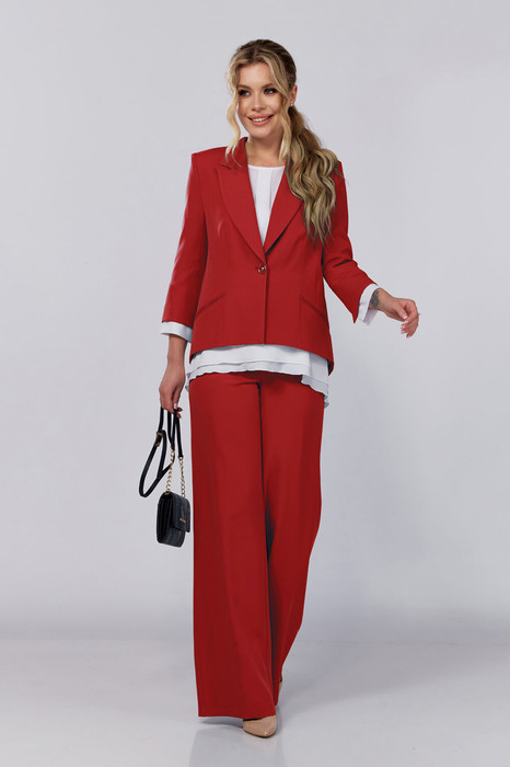 Элегантный брючный костюм в комплекте с шифоновой блузкой.Жакет полуприлегающего силуэта с воротником и лацканами классической формы, застежкой на 1 пуговицу. Особое внимание заслуживает экстравагантная спинка с имитацией запаха и серебристыми металлическими акцентами в виде цепочек, соединяющих две половинки отлетной спинки.Брюки прямого покроя расширены от линии бедра. Комфортная посадка брюк и подчеркивающий фигуру крой сделает их любимым предметом вашего гардероба.Костюм выполнен из материала модных цветов, не требующего особого ухода, пластичен и удобен в носке.Блузка-туника нежного молочного пастельного оттенка с шифоновыми рукавами. Блуза очаровывает своим красивым непринужденным полуприлегающим силуэтом, фигурной линией низа, и конечно же спинкой.Фантазийная спинка с шифоновыми вставками и воланами, красиво драпирующимися и являющимися одним из популярных трендов, шикарно смотрится как самостоятельно, так и в сочетании с эффектным разрезом на жакете.