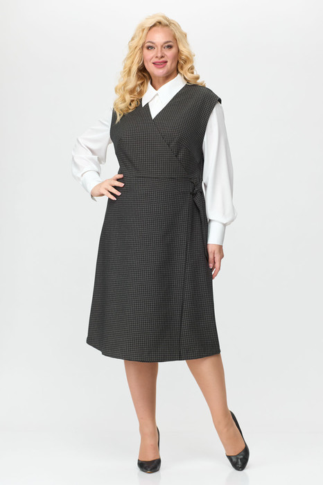Идеальный офисный комплект состоит из сарафана и блузки. Сарафан полуприлегающего силуэта, отрезной по линии талии, на запах с поясом. Полочка с нагрудными вытачками. Спинка со средним швом. Обтачка по спинке (обработка горловины), глубокая. Блуза прямого силуэта, нежная и струящаяся, ткань стойкая к сминанию. По центру полочки застежка в виде планки на 7 петель, 7 пуговиц. Воротник стояче-отложной, рукав втачной, внизу обработан притачной манжетой. В боковых швах небольшие разрезы.