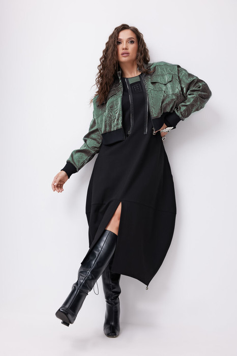 Комплект женский из двух видов ткани, состоящий из платья и бомбера. Платье А-образного силуэта со спущенной линией плеча, вырез горловины круглый, по переду подрезы и разрез в нижней части, по переду боковые карманы. По спинке подрезы и средний шов с потайной молнией, рукав втачной длинный. В боковых швах кулисы с фиксатором. Перед декорирован фирменным логотипом и настрочной деталью и молниями. Бомбер прямого силуэта. По переду кокетки, подрезы и клапаны. По спинке фигурная кокетка и подрезы. Рукав цельнокроеный с манжетой из трикотажного полотна, воротник стойка, застежка на молнию. По низу переда и спинки притачная планка из трикотажного полотна. В комплекте использованы молнии, позволяющие объединить платье и бомбер.