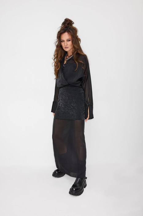 Комплект женский,  состоящий из рубашки и юбки. Рубашка с длинным  цельнокроеным рукавом, заканчивающимся притачной манжетой (на застежку пуговицу).  Воротник стояче-отложной. Перед рубашки с застежкой на планку, петли и пуговицы. Перед с накладными карманами. В боковых швах разрезы. Юбка прямого силуэта, длинная, состоящая из двух видов ткани. Выполнена,  как имитация двойной юбки. Верх юбки на обтачке, застежка - молния в  среднем шве спинки. Нижняя юбка с высокими боковыми разрезами.
