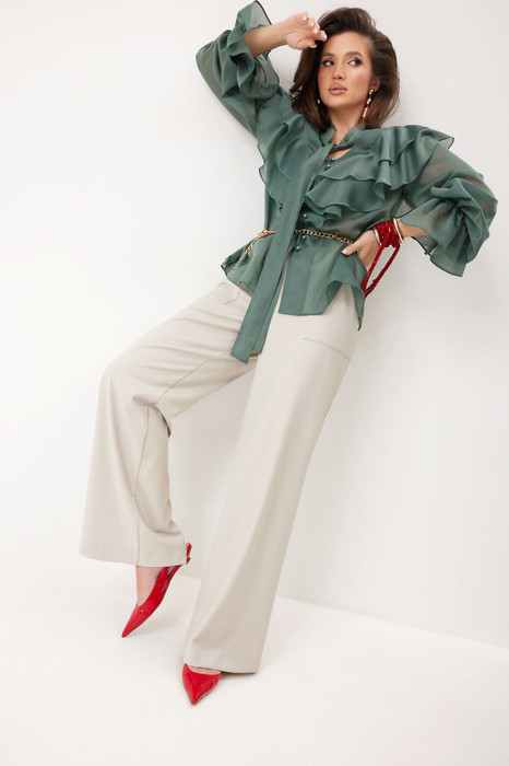 Комплект женский состоящий из блузы и брюк. Блуза прямого силуэта с длинным втачным рукавом оформлена со сборкой по окату и воланом на резинке по низу. По передней части  центральная  застежка с навесными петлями и пуговицами. Вырез горловины имеет Y-образную форму с воротником-стойкой, переходящим в завязывающийся бант. Перед и спинка с фигурными кокетками. В швы вставлены двойные воланы разной ширины, добавляя модели  выразительность и объем. Брюки прямого силуэта с классической посадкой дополнены накладным карманом на молнии, петлями и пуговицами на передней части. По задней части талиевые вытачки. Притачной пояс с резинкой по боковым и задним частям обеспечивает комфортную посадку. В комплекте есть декоративный пояс.