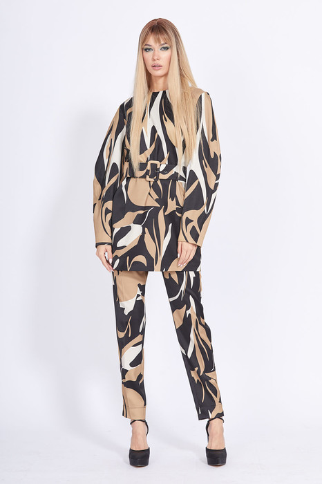 Комплект: платье + брюки. Комплект выполнен из атласа с абстрактным принтом. Платье полуприлегающего силуэта, длиной до середины бедра. Застежка на потайную молнию в среднем шве спинки. Горловина округлой формы. Плечевой шов спущен. Рукав двухшовный, объемной формы. Платье на притачной по низу подкладке. Брюки на притачном поясе, заужены к низу, длиной 7/8. Передние и задние части заутюжены на кант. Застежка на пуговицу и потайную молнию в левом боковом шве. По низу брюк сбоку разрезы. В комплект входит съемный ремень из основной ткани с обтяжной пряжкой.