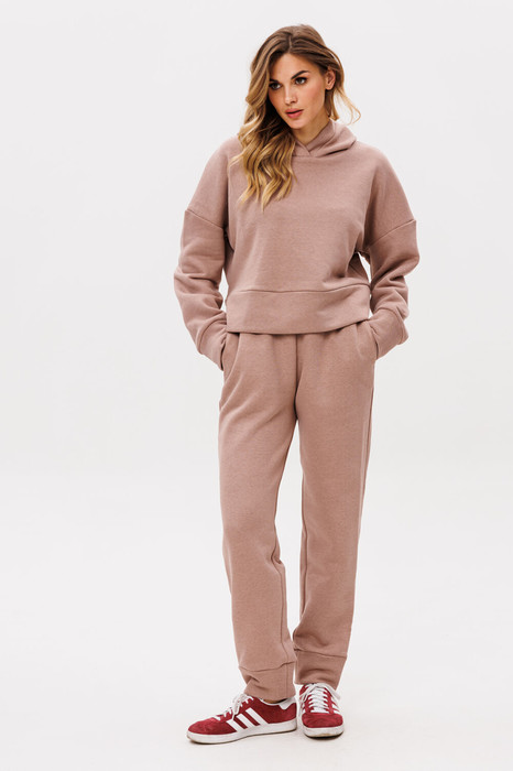 Комплект: джемпер + брюки. Комплект выполнен из трикотажного полотна. Джемпер прямого силуэта, длиной ниже линии талии. Перед и спинка цельные. Горловина обработана капюшоном. Плечевой шов спущен. Низ рукава и низ джемпера на манжете из основной ткани. Брюки на притачном поясе с эластичной тесьмой, заужены к низу. Спереди боковые карманы с наклонным входом. Низ брюк на притачной манжете из основной ткани. В поясе обработаны петли и втянут шнур.