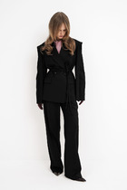 Костюм женский 3х предметный состоит тз брюк блузы и жилета, блуза выполнена из хлопковой ткани, полуприлегающего кроя , горловина воротник на стойке, рукав втачной с высокой манжетой по низу рукава, застежка - планка с петлей пуговицей, низ фигурный. Жилет свободного кроя, укороченный, воротник отложной с лацканами, по переду жилета съёмный пояс, с застежкой петли -пуговицы. Брюки средней посадки, прямого кроя на притачном поясе с резинкой, в боковых швах имеются карманы, застежка петля- пуговица и молния на гульфике