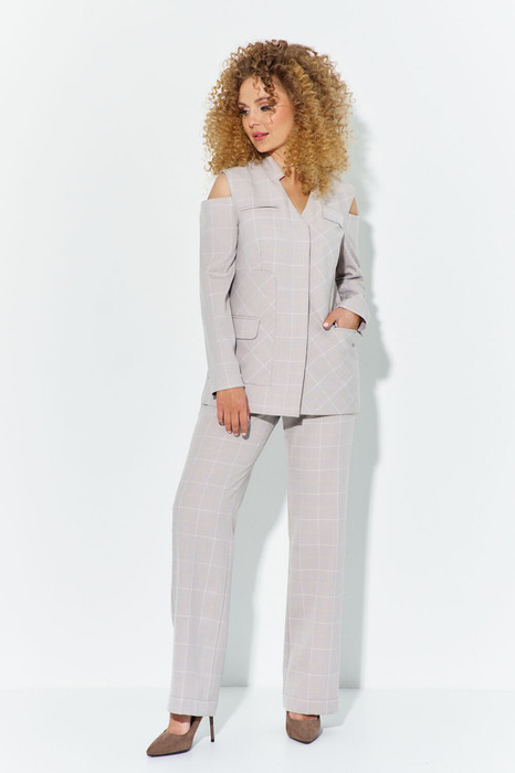 Костюм женский 2х предметный выполнен из тонкой костюмной ткани, состоит из Жакета и брюк. Жакет полуприлегающего силуэта, по полочке жакета расположена накладная деталь с функциональным прорезным карманом "рамка", и декоративные фальш-карманы в области груди. Рукав втачной длинный, с открытыми плечами. горловина обработана плоско лежащим воротником -стойкой. Застежка жакета - потайная (супатная) на петли-пуговицы. Жакет на полной подкладке. Брюки классического кроя, прямые от бедра, с высокой посадкой. На брюках расположены функциональные карманы по переду, и прорезной карман с листочкой на задних частях брюк. Пояс в брюках втачной с резинкой, застежка молния на гульфике и петля- пуговица.