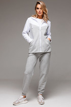 Костюм женский двухпредметный, выполнен из сочетания хлопковой и костюмной ткани, состоит из блузона и брюк. Блузон с имитацией асимметричного корсета, горловина- округлая, рукав приспущенный втачной длинный с манжетой по низу. Спинка разрезная с застежкой петли-пуговицы. Брюки с завышенной посадкой, на притачном поясе с резинкой в боковых швах расположены карманы. Застежка молния на гульфике