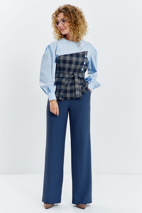 Костюм женский двухпредметный, выполнен из сочетания хлопковой и костюмной ткани, состоит из блузона и брюк. Блузон с имитацией асимметричного корсета, горловина- округлая, рукав приспущенный втачной длинный с манжетой по низу. Спинка разрезная с застежкой петли-пуговицы. Брюки с завышенной посадкой, на притачном поясе с резинкой в боковых швах расположены карманы. Застежка молния на гульфике