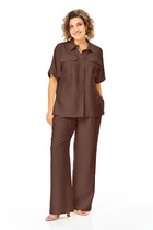 Костюм женский 2х-предметный состоит из жакета и брюк. Жакет прилегающего кроя, по полочке жакета расположены прорезные карманы с клапанами. Горловина - отложной воротник с лацканами. Рукав втачной длинный. Застежка петля-пуговица. Брюки прямого кроя с высокой посадкой, на притачном поясе со вставками эластичной тесьмы. в боковых швах брюк -палаццо имеются карманы. Застежка - молния на гульфике, петля-пуговица. Жакет без подкладки