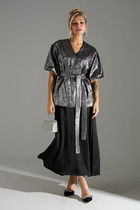 Свободный силуэт с заниженной линией плеча, рукав, расширенный в области оката, центральная застёжка на петли и пуговицы, стояче-отложной воротник.