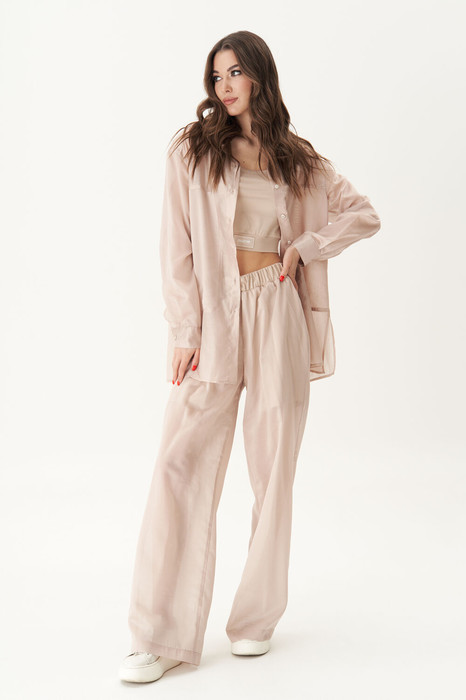 Свободная, невесомая рубашка, майка-топ и прозрачные брюки с эластичными шортами внутри.