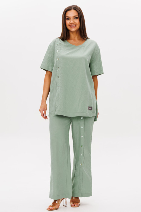 Брюки свободные, широкие, на эластичном поясе с наклонными карманами. Левая передняя половинка брюк со сквозной шлицей и пуговицами.