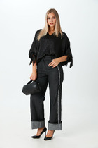 Юбка коническая, на притачном эластичном поясе с дополнительным шнуром-резинкой и фиксатором. По переднему полотнищу - застёжка-молния и боковые карманы с отделочными молниями"