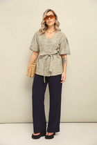 Жакет из необычного по текстуре материала с вкраплением пайетки, брюки из полотна без пайетки. Полуприлегающий силуэт пиджака с центральной застёжкой, круглым вырезом горловины и втачным покроем. Полочка с фигурным рельефом, спинка с фигурным рельефом, центральным швом и плечевыми вытачками. Рукав двухшовный.