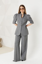 Длина рукава с плечом около 74 см. Брюки покроя ""barrel"", расширенные в области икры и зауженные к низу. Пояс притачной, эластичный в области спинки. По передним половинкам брюк-застежка и боковой наклонный карман. По задним-вертикальный шов. Боковой шов смещен в сторону центра передних половинок брюк. По низу-пата с регулирующими пуговицами, позволяющая создавать разную ширину брюк внизу.