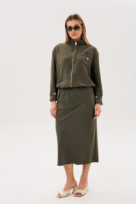 "Этот вариант комплекта практически универсален, поскольку одинаково хорошо подойдет и молодым девушкам и леди элегантного возраста. Для тех, кто ищет комфортную повседневную одежду, интересную и привлекательную, модель просто идеальна. Свободная куртка на подкладке и юбка, косого кроя, из невероятного полотна с эффектом ""бархатистости"" или в народе ""мокрым эффектом"". Куртка свободного силуэта, рубашечного покроя с воротником-стойкой и центральной застежкой на тесьму-молнию. Полочка с накладным карманом в области груди. Рукав с патой на пуговице в нижней части. По низу куртки-кулиса, с эластичной тесьмой и фиксаторами. Юбка на подкладке, косого кроя, с застежкой по боковому шву на потайную молнию и пуговицу и эластичным притачным поясом.