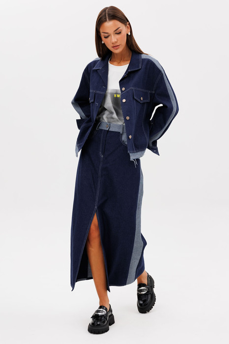 Юбка классическая джинсовая, слегка расширенная к низу, с 5-ю карманами. Пояс притачной контрастного цвета. По боковому шву контрастный лампас, подзоры передних карманов также из контрастного джинса. Переднее полотнище юбки с центральным швом, разрезом и застёжкой. Спинка с центральным швом, отрезной кокеткой и накладными карманами.