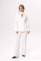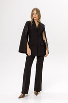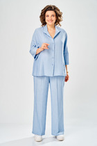 Костюм с жилетом - прекрасное решение для смелых экспериментов. Жилет полуприлегающего силуэта с асимметричной застёжкой, фигурной линией низа и регулирующийся кулисе по спинке. Полочки с отрезным бочком и нагрудными вытачками, спинки - с центральным швом, отрезным бочком и регулирующийся кулисой с фиксаторами. Брюки "баррел" на притачном поясе со шлёвками (эластичном в области спинки), с наклонными карманами , мягкими складками защипами по верху брюк и вытачками по низу. Джемпер трикотажный, с длинным рукавом, полуприлегающего силуэта.