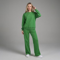 Костюм из гладкокрашеного трикотажного полотна «футер-двунитка», состоящий из джемпера и брюк. Джемпер - прямого силуэта, с длинными втачными рукавами, горловиной овальной формы, обработанной втачной планкой, притачным поясом и принтом на полочке, выполненным методом шелкографии. Манжеты рукавов, планка горловины и полупояса по низу изделия выполнены из эластичного полотна «рибана» в тон основному материалу, боковые швы смещены в сторону переда. Брюки – длинные слегка расширенные книзу, на притачном поясе с эластичной тесьмой внутри и карманами в боковых швах.