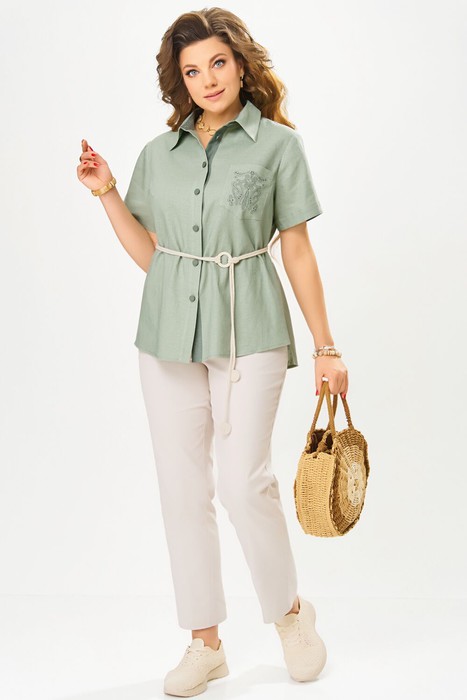 Стильные детали делают блузку особенной: накладной карман с декоративной печатью на левой полочке добавляет оригинальности, а спинка с изящным принтом подчеркивает индивидуальность модели. Втачные одношовные рукава завершаются обработанной отделочной тканью обтачкой, создавая утонченный акцент. Завершает образ съемный пояс, позволяющий варьировать посадку и силуэт.