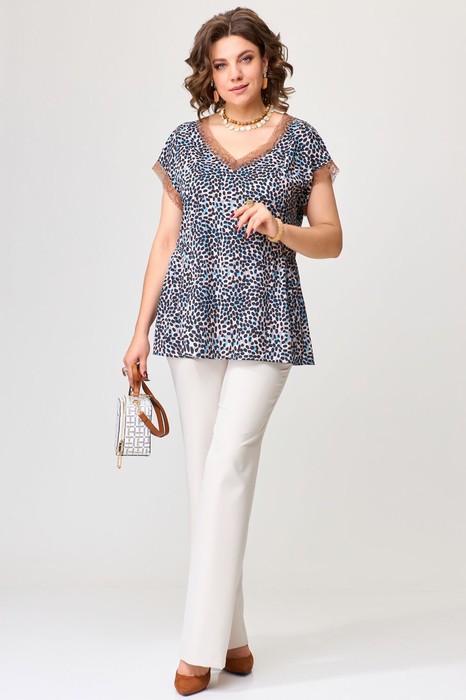 Женский комплект двойка РУЖАНА состоит из блузки и брюк. Блуза изготовлена из легкой текстильной ткани (искусственный шелк). Блузка полуприлегающего силуэта со спущенным рукавом, по полочке и спинке рельефы, по талии подрезы со сборкой. По горловине блузки нашито тонкое кружево, низ рукава обработан кружевом. Низ изделия обработан швом в подгибку. Брюки прямого силуэта с застежкой на молнию и пуговицу. По переду брюк карманы, верх брюк обработан поясом, по спинке резинка. Низ обработан в подгибку.