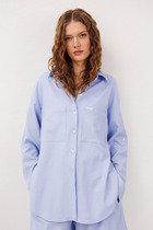 Рубашка прямого силуэта, застежка однобортная на петли и пуговицы. Воротник рубашечного типа со стойкой. По спинке рубашки отрезная кокетка, рукава втачные одношовные, по низу рукава манжета с застежкой на петлю и пуговицу. Низ изделия обработан швом в подгибку с открытым срезом.