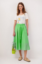 Брюки свободные, прямого силуэта. Пояс цельнокроеный на резинке, в боковых швах - карманы. Низ брюк обработан швом в подгибку с открытым срезом.
