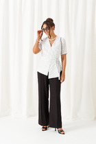Нарядная блузка выполнена из мягкой трикотажной сетки в пайетки. Блузка полуприлегающего силуэта с драпировкой по полочке. Горловина в блузке v-образной формы, по низу разрез. Рукава в блузке втачные, одношовные, по низу рукава две декоративных складки. Низ изделия и низ рукавов обработаны бейкой, застроченной на 0,7 мм.