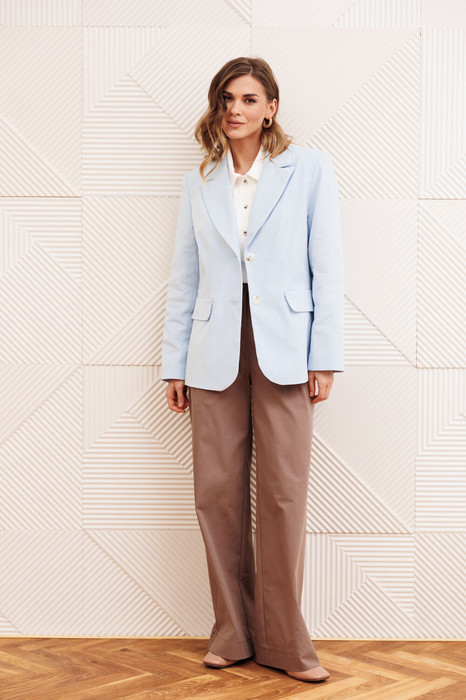 Костюм состоит из жакета и брюк из джинсовой хлопковой  ткани. Жакет полуприлегающего силуэта  с  воротником пиджачного типа.  Застежка однобортная на две пуговицы.  Перед с талиевой вытачкой, рельефом и декоративным клапаном. Спинка с рельефами из проймы и средним швом.  Рукав втачной двухшовный. Брюки расширеные книзу на притачном поясе. По поясу настрочены шлевки. По передним и задним частям брюк вытачки. На задних частях брюк настрочены карманы. Карманы, вытачки, пояс, низ брюк отделаны отделочной строчкой. Длина жакета - 68см, длина рукава жакета - 60 см, длина брюк с учетом пояса -107 см
