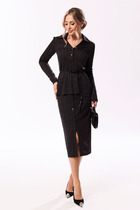 Джемпер прямого силуэта с воротником поло из плотной хлопковой ткани "двухнитка". Рукав втачной одношовный. По низу изделия, по низу рукава и по воротнику проложена отделочная строчка. Брюки палаццо с притачным поясом из мягкой вельветовой ткани. Спереди застежка гульфик на молнии и петлей и пуговицей по поясу. По задней частям брюк вытачки. Пояс с резинкой в боковых частях. Брюки с заутюженными стрелками. Длина джемпера- 66 см, длина рукава - 60 см. Длина брюк с учетом пояса - 109 см.