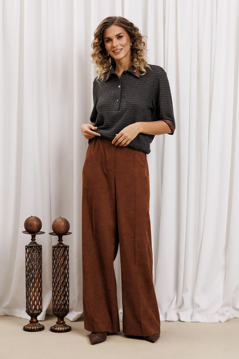 Костюм состоит из джемпера и брюк. Джемпер прямого силуэта из трикотажного ажурного полотна. Перед с застежкой поло и нагрудными вытачками. По воротнику и низу рукава настрочена декоративная тесьма. Длина джемпера - 69 см, длина рукава - 32 см. Брюки палаццо с притачным поясом из мягкой вельветовой ткани. Спереди застежка гульфик на молнии и петлей и пуговицей по поясу. По задней частям брюк вытачки. Пояс с резинкой в боковых частях. Брюки с заутюженными стрелками. Длина брюк с учетом пояса - 109 см.