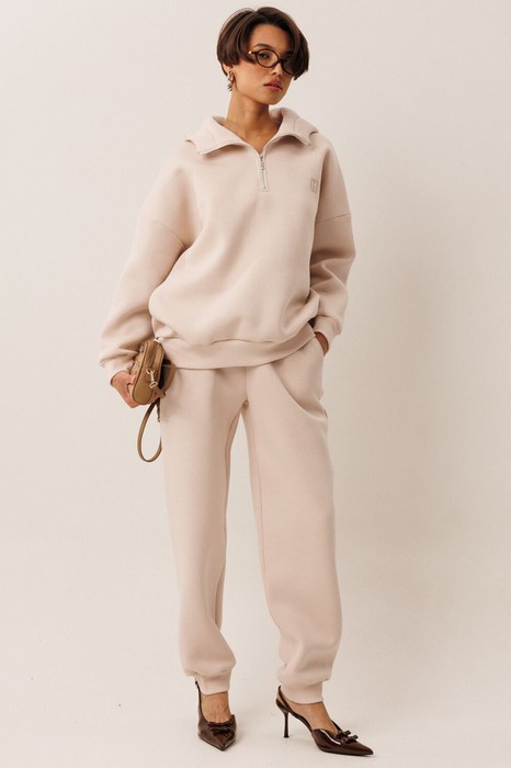 " Этот спортивный костюм от GOwear отлично подойдет для дома, прогулок, путешествий и отдыха. Сделан из теплой, комфортной ткани. Состоит из джемпера и брюк. Джемпер имеет  двойной капюшон и короткую застежку - молнию черного контрастного цвета по центру переда. На переде с левой стороны выполнена вышивка в цвет ткани. Джемпер имеет прямой силуэт. Низ джемпера и манжеты выполнены из кашкорсе.  Брюки зауженные к низу с притачным поясом (резинка и шнурок внутри). Брюки с боковыми карманами. По низу брюк – манжеты.