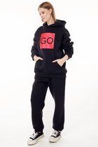 Современный, женственный костюм, покроя oversize из комфортной ткани (футера пенье). Костюм состоит из джоггеров и свободного свитшота с воланом. Волан с необработанным краем (укреплён строчкой для надежности) пришит асимметрично на левой стороне изделия. Свитшот имеет спущенную линию плеча, прямой силуэт и притачную манжету по низу изделия. По центру переда вышивка – логотип в цвет ткани. Рукава с притачной по низу манжетой. Бейка горловины, низ изделия и манжеты рукавов выполнены из ткани - компаньона кошкорсе. Брюки с притачным поясом, резинкой внутри. Передняя половинка брюк с удобными боковыми карманами. Низ брюк присобран на резинку.
