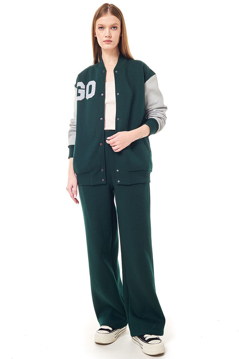 Современный женский костюм, состоящий из бомбера и брюк. Бомбер свободного силуэта, выполнен из ткани-футера двух цветов с застежкой на металлические кнопки. На переде функциональные прорезные карманы и дизайнерская нашивка в виде букв “GO” на правом переде. Низ изделия, горловина, манжеты рукавов выполнены из ткани-компаньона кошкорсе. Брюки прямого силуэта с притачным поясом, резинкой внутри. Передняя половинка брюк с удобными боковыми карманами.