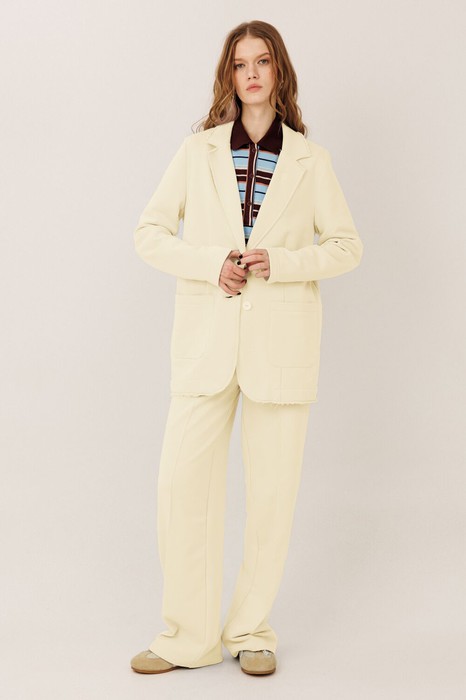 Костюм Gowear из футера в стиле smart casual поможет создать в меру строгий и одновременно расслабленный образ. Костюм состоит из жакета и прямых брюк. Жакет прямого силуэта с воротником и лацканами, имеет удобные карманы и застежку на 2 пуговицы. На левом лацкане вышивка-логотип в контрастном цвете. Низ и борта имеют открытые края (эффект необработанного шва), укреплены дополнительной строчкой. Жакет без подкладки. Брюки прямые. На передних половинках - отделочная строчка по стрелкам и удобные боковые карманы. Пояс из ткани кошкорсе, с резинкой и контрастным шнурком.