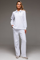 Костюм Gowear из футера в стиле smart casual поможет создать в меру строгий и одновременно расслабленный образ. Костюм состоит из жакета и прямых брюк. Жакет прямого силуэта с воротником и лацканами, имеет удобные карманы и застежку на 2 пуговицы. На левом лацкане вышивка-логотип в контрастном цвете. Низ и борта имеют открытые края (эффект необработанного шва), укреплены дополнительной строчкой. Жакет без подкладки. Брюки прямые. На передних половинках - отделочная строчка по стрелкам и удобные боковые карманы. Пояс из ткани кошкорсе, с резинкой и контрастным шнурком.