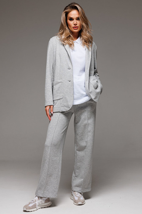 Костюм Gowear из футера в стиле smart casual поможет создать в меру строгий и одновременно расслабленный образ. Костюм состоит из жакета и прямых брюк. Жакет прямого силуэта с воротником и лацканами, имеет удобные карманы и застежку на 2 пуговицы. На левом лацкане вышивка-логотип в контрастном цвете. Низ и борта имеют открытые края (эффект необработанного шва), укреплены дополнительной строчкой. Жакет без подкладки. Брюки прямые. На передних половинках - отделочная строчка по стрелкам и удобные боковые карманы. Пояс из ткани кошкорсе, с резинкой и контрастным шнурком.