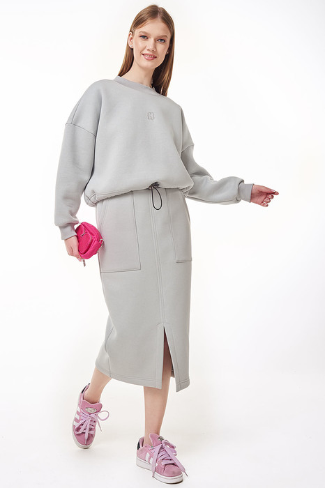 Современный комфортный костюм, состоит из зауженной юбки и укороченного свитшота. Отлично подойдёт для офиса, прогулок и путешествий. Пошит из теплой, комфортной ткани. Свитшот покроя оверсайз со спущенной линией плеча. Горловина, манжеты рукавов выполнены из ткани-компаньона кошкорсе. По центру переда вышивка-логотип в цвет ткани. Свитшот с кулисой по низу с резинкой внутри и фиксатором по центру переда. Юбка зауженная к низу, облегающая фигуру, длиной миди. Перед с удобными боковыми карманами, по центру переда разрез с отделочной строчкой. Пояс из ткани кошкорсе с резинкой внутри.