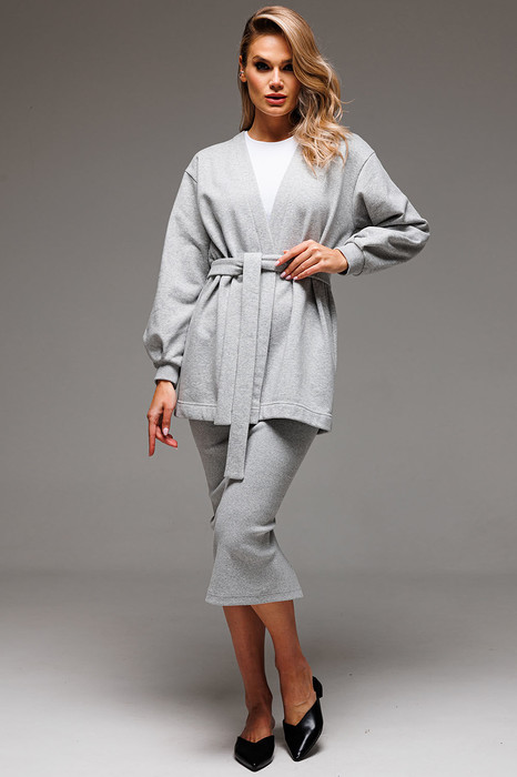 Костюм Gowear из футера в стиле smart casual поможет создать в меру строгий и одновременно расслабленный образ. Костюм состоит из жакета и юбки из эластичной ткани кошкорсе. Жакет прямого силуэт, с v-образным вырезом горловины, без застежки, с отдельным поясом. На левом переде вышивка-логотип в цвет ткани. Рукав свободный, со складками, присобран на манжету. Жакет без подкладки. Юбка прямая, облегающая фигуру с разрезом на спинке. Пояс цельнокроенный с резинкой внутри.